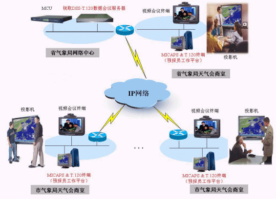 在上圖的應用案例中,DSS-T.120數(shù)據(jù)會議服務器和MCU通常放置在省氣象局網(wǎng)絡中心,視頻會議終端和預報員工作平臺(MICAPS系統(tǒng))放置在各級氣象部門的天氣會商室中。在進行遠程可視天氣會商時,系統(tǒng)通過MCU和視頻會議終端進行視頻、音頻的交互;通過DSS-T.120數(shù)據(jù)會議服務器和運行在預報員工作平臺上的T.120終端軟件進行數(shù)據(jù)的交互,各級預報員在彼此之間看到圖像聽到聲音的同時,可以看到正在做匯報的預報員共享的MICAPS系統(tǒng)中的內(nèi)容,如高空圖、地面圖、云圖等預報基礎素材,觀看效果如同在本地會商室一樣。在本案例中通過T.120數(shù)據(jù)會議系統(tǒng)與視頻會議系統(tǒng)的配合,可以進行視頻、音頻、數(shù)據(jù)全面的交互,真正實現(xiàn)了預報員之間"面對面"的交流。