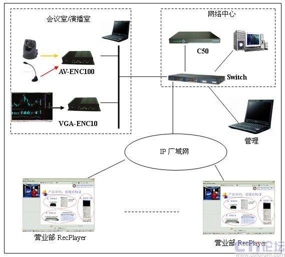在分析了海通證券的實際需求和網絡環(huán)境以后,決定采用一套DSS-R-C50+來組建整個媒體廣播系統(tǒng)。系統(tǒng)由媒體采集系統(tǒng)AV-ENC100/VGA-ENC100,流媒體處理和錄制系統(tǒng)C50和媒體接收系統(tǒng)RecPlayer組成。通過此系統(tǒng)可以實現語音、視頻和計算機桌面的同步實時直播、錄制和點播。系統(tǒng)的結構圖如下: