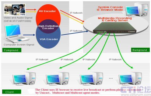 Encoder可用于采集高清視頻的信號(hào)或者VGA的信號(hào)。前臺(tái)的編碼器編碼好通過(guò)IP網(wǎng)絡(luò)傳送到服務(wù)器Multimedia