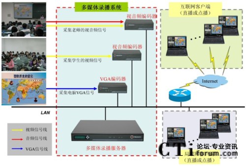 廣州市旅游職業(yè)學(xué)校多媒體錄播系統(tǒng)組網(wǎng)如上圖所示。在本項(xiàng)目中編碼器和多媒體錄播服務(wù)器分別部署在教室和機(jī)房內(nèi),前端的視音頻編碼器采集老師、學(xué)生的視音頻信號(hào),VGA編碼器采集PPT內(nèi)容,編碼器采集信號(hào)并編碼后通過網(wǎng)絡(luò)發(fā)送給多媒體錄播服務(wù)器,多媒體錄播服務(wù)器接收并實(shí)現(xiàn)同步錄制、直播及事后點(diǎn)播。老師、學(xué)生可在教室、辦公室、宿舍等任何可以連接校園網(wǎng)的地方實(shí)時(shí)觀看教室內(nèi)進(jìn)行的課程,可滿足日常多媒體教學(xué)、課件錄制、微格教學(xué)等應(yīng)用的需要。
