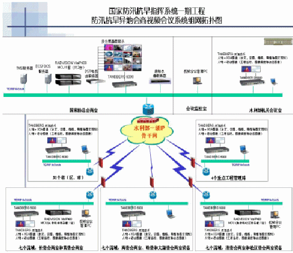 "工欲善其事,必先利其器"。為了推動(dòng)國(guó)家"金水工程"對(duì)信息化的要求,2003年,水利部就開始著手籌建國(guó)家防汛抗旱指揮視頻會(huì)議系統(tǒng)。按照當(dāng)初的項(xiàng)目規(guī)劃,這次視頻會(huì)議系統(tǒng)的建設(shè)主要包括水利部、7個(gè)流域機(jī)構(gòu)、31個(gè)。▍^(qū)、市)和4個(gè)重點(diǎn)工程局等43個(gè)單位的44個(gè)節(jié)點(diǎn)。