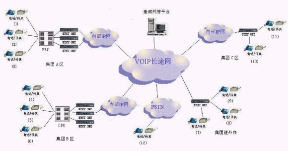 深圳市蓋威科技有限公司完整的語(yǔ)音解決方案如下,用一個(gè)網(wǎng)管平臺(tái)(AVS SERVER)來(lái)管理眾多企業(yè),各企業(yè)分支機(jī)構(gòu)間可以實(shí)現(xiàn)相互通話免話費(fèi),另外將企業(yè)內(nèi)部通話之外的電話通過網(wǎng)管平臺(tái)接入到電信營(yíng)運(yùn)商的VoIP 網(wǎng)中,并由網(wǎng)管平臺(tái)負(fù)責(zé)認(rèn)證和計(jì)費(fèi)。網(wǎng)管平臺(tái)還提供備份路由機(jī)策略,可根據(jù)需要指定路由。具體的網(wǎng)絡(luò)方案如下圖所示: