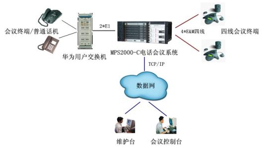 在接入上,通過2個(gè)數(shù)字中繼與華為大型用戶交換機(jī)互連,實(shí)現(xiàn)華為用戶交換機(jī)下的模擬用戶作為與會用戶的接入,也可通過華為交換機(jī)出局,實(shí)現(xiàn)PSTN網(wǎng)內(nèi)的用戶接入。