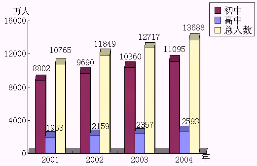 據(jù)國家最新統(tǒng)計資料分析,2001年中學學生人數(shù)已達10765萬人,而且學生人數(shù)還在快速增長。初中學生人數(shù)以每年6.5%的速度增長,普通高中學生人數(shù)也以每年10%-11%的速度增長。
