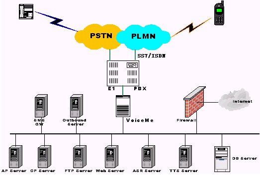 整個系統(tǒng)平臺前端接入可直接從電信或移動交換機提供的信號接入,如中國一號、SS7以及ISDN等,通過PBX連入平臺核心VoiceMe服務(wù)器,系統(tǒng)接入容量可擴至幾十個乃至上百個E1接入。系統(tǒng)主要包括語音控制、多媒體應用和內(nèi)容管理等部分,其中主要包括: