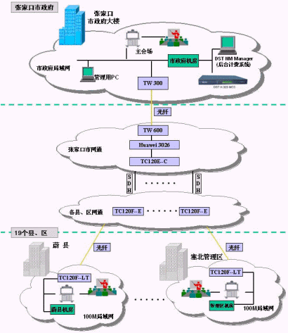 張家口市地處河北省與內(nèi)蒙古交界處,地域廣闊,如何實(shí)現(xiàn)方便、及時(shí)、快捷的溝通一直困擾著市政府。其下設(shè)的19個(gè)區(qū)縣的線路質(zhì)量參差不齊,整個(gè)網(wǎng)絡(luò)環(huán)境非常復(fù)雜。經(jīng)過一系列的商討,張家口政府成為了聯(lián)通公司第一位簽約用戶。