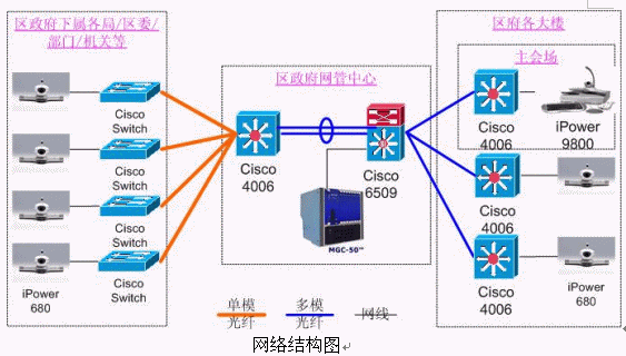 9800,分會場使用iPower 680。網(wǎng)管中心安放一臺Polycom 公司的MGC-50(多點(diǎn)會議控制單元),用于對全網(wǎng)終端的控制,實(shí)現(xiàn)多點(diǎn)間、點(diǎn)對點(diǎn)會議。各視頻設(shè)備通過網(wǎng)線連接在各主要交換機(jī)上。