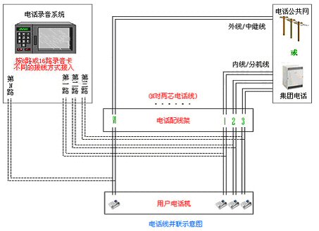 普通電腦或工控機(jī)(P233/32M/6.4G以上)。   1. 電話線并聯(lián)方式:(在配線架上將電話線路一分為二,一路到電話機(jī),一路到錄音卡)