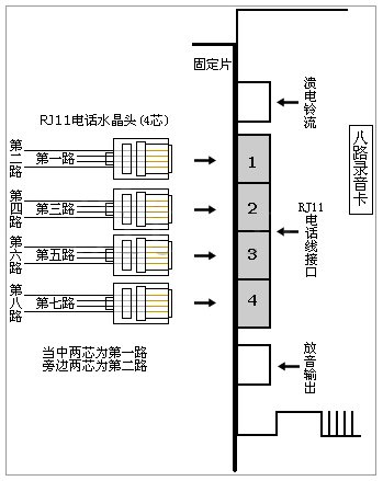 3. 8路錄音卡接線方式:(每個(gè)RJ11水晶頭,當(dāng)中兩芯為第一路,旁邊兩芯為第二路)