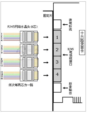 4.16路錄音卡接線方式:(每個(gè)RJ45水晶頭,依次每?jī)尚緸橐宦?