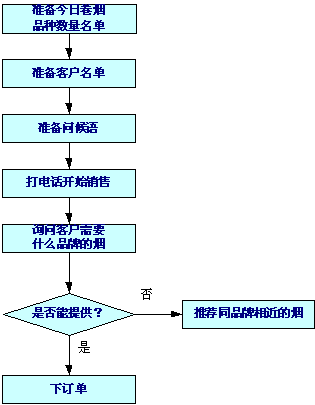 。。我們的訪銷流程是:準(zhǔn)備今日卷煙品種數(shù)量名單---準(zhǔn)備客戶名單---準(zhǔn)備問(wèn)候語(yǔ)---打電話開始銷售---先問(wèn)客戶需要什么煙---如能提供的就下訂單。如有不能提供的,向其推薦同品牌相近的煙 。 (請(qǐng)?jiān)斠娨韵铝鞒虉D)