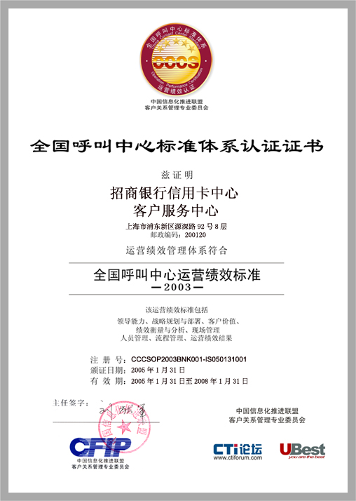 經(jīng)過長達(dá)8個(gè)月時(shí)間的準(zhǔn)備和嚴(yán)格的認(rèn)證審核,由中國信息化推進(jìn)聯(lián)盟客戶關(guān)系管理專業(yè)委員會常務(wù)副主任郭晨東先生親自掛帥組成的項(xiàng)目評審專家小組從領(lǐng)導(dǎo)能力、戰(zhàn)略規(guī)劃與部署、客戶價(jià)值、績效衡量與分析、現(xiàn)場管理、人員管理、流程管理、運(yùn)營績效結(jié)果等八個(gè)范疇對招商銀行信用卡中心客戶服務(wù)部進(jìn)行了全面而嚴(yán)格的審核,涉及五大類上百項(xiàng)詳細(xì)的運(yùn)營績效指標(biāo),歷經(jīng)初審評估、現(xiàn)場初審、初審評估報(bào)告提交與確認(rèn)、標(biāo)準(zhǔn)試運(yùn)行、績效全面提升、最終評審等階段,最終審核確認(rèn)招商銀行信用卡中心客戶服務(wù)完全符合并部分超越《全國呼叫中心運(yùn)營績效標(biāo)準(zhǔn)》(CCCS-OP-2003)的各項(xiàng)標(biāo)準(zhǔn)指標(biāo)和要求,于2005年1月31日正式批準(zhǔn)招商銀行信用卡中心通過該標(biāo)準(zhǔn)的五星級認(rèn)證,授予“五星級客戶服務(wù)中心”稱號。