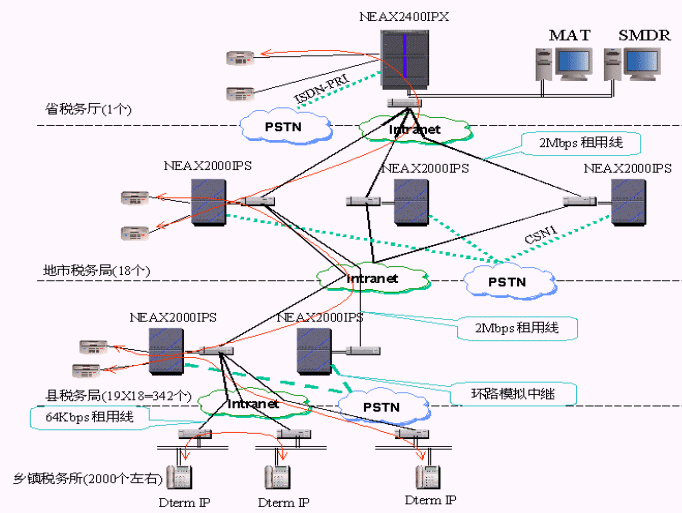 NEC公司為該省稅務提供了2003年全球同步推出的NEAX 2400及NEAX2000交換機系統(tǒng),為用戶提供了傳統(tǒng)時分交換系統(tǒng)和VoIP交換的完美結(jié)合,即具備VoIP功能又支持交換機的豐富功能,如豐富的終端,豐富的組網(wǎng)中繼和信令,語音信箱,多方會議,無線通信,統(tǒng)一計費等等。