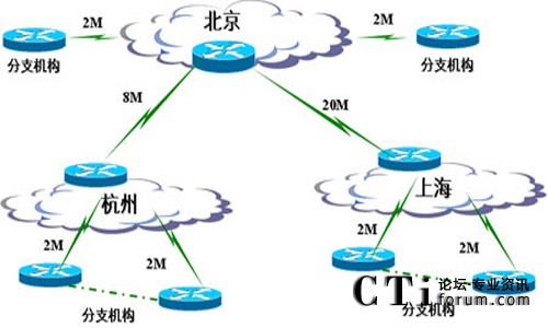 網(wǎng)絡(luò)結(jié)構(gòu)為星形為主,部分節(jié)點(diǎn)為樹狀。深圳總部作為主會議中心,以星形方式連接到營業(yè)部分會議中心,廣州地區(qū)30家營業(yè)部通過2M線路連接到廣州中心機(jī)房,廣州中心通過64M的線路連接到深圳總部;北京15家營業(yè)部通過4M線路連接到北京中心機(jī)房,北京中心機(jī)房通過10M線路連接到深圳總部,未來北京地區(qū)的15家營業(yè)部也要調(diào)整為直接連接到深圳總部;深圳9家營業(yè)部通過4M線路連接到深圳中心機(jī)房,深圳中心機(jī)房通過64M線路連接到深圳總部。