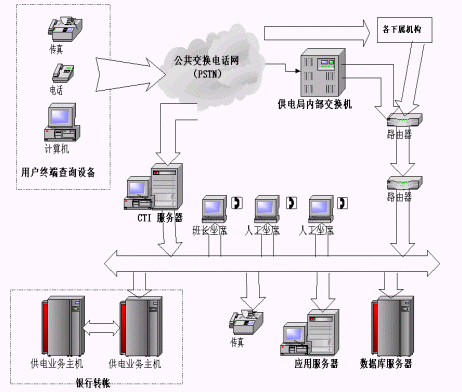 (3)自動(dòng)轉(zhuǎn)人工服務(wù)。系統(tǒng)還可自動(dòng)轉(zhuǎn)接人工坐席,由電力專業(yè)人員負(fù)責(zé)解答和處理客戶意見(jiàn);蛘邔⒖蛻舴⻊(wù)中心系統(tǒng)與后臺(tái)數(shù)據(jù)庫(kù)服務(wù)器相接,通過(guò)客戶提供的相關(guān)信息,為客戶提供個(gè)性化的在線服務(wù)。