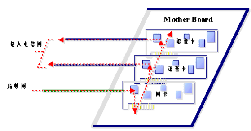 通過局域網(wǎng)傳遞語音數(shù)據(jù)本來就不能保證其時實時性,其結(jié)果就是用戶聽到的語音經(jīng)常斷續(xù),保證不了語音質(zhì)量。如果傳遞的語音數(shù)據(jù)是經(jīng)過壓縮的,語音數(shù)據(jù)本來就是通過TTS進(jìn)行合成的,再經(jīng)過壓縮,則音質(zhì)會有很大的損傷,因此同樣保證不了語音質(zhì)量。從上圖中我們可以看到,經(jīng)TTS合成的語音數(shù)據(jù)從局域網(wǎng)經(jīng)過網(wǎng)卡,再通過主板PCI(或ISA)總線進(jìn)入語音卡,最后進(jìn)入電信網(wǎng),同樣語音數(shù)據(jù)通過計算機(jī)主板經(jīng)PCI(或ISA)總線進(jìn)入語音卡也要求是實時的。這兩種實時性的要求會導(dǎo)致在接入量比較大的情況下,會給計算機(jī)的總線造成很大的負(fù)擔(dān)。因為總線的帶寬(數(shù)據(jù)吞吐量)是有限的。況且其它的板卡和接口(如聲卡、顯示卡等)也要直接或間接地占用總線。因此在接入量比較大的情況下,計算機(jī)的總線帶寬會成為一個比較關(guān)鍵的瓶頸。即便提高語音板卡的接入能力。在有大量電話接入的情況下,由于語音數(shù)據(jù)實時性的要求,也不能保證語音質(zhì)量。