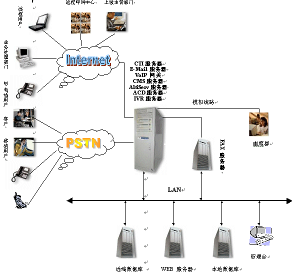 另一方面,CTI(計算機語音集成)技術(shù)的出現(xiàn),實現(xiàn)了通信技術(shù)與計算機技術(shù)的結(jié)合,利用計算機技術(shù)可以大大增加服務(wù)的信息量、提高速度、拓展新型客戶服務(wù)業(yè)務(wù)。因此為了滿足計算機、信息技術(shù)的演進和客戶服務(wù)的需求,利用CTI技術(shù),面向用戶,提供綜合服務(wù)的客戶服務(wù)中心系統(tǒng)應(yīng)運而生。對于用戶,客戶服務(wù)中心系統(tǒng)能夠提供更優(yōu)質(zhì)的用戶服務(wù),用戶能從服務(wù)方得到最快的響應(yīng),能夠得到24小時的持續(xù)服務(wù),能夠同時得到語音、圖象、數(shù)據(jù)多方面的信息支持。對于企業(yè),客戶服務(wù)中心在提高客戶服務(wù)質(zhì)量的同時,還能有效的控制成本、增加收入,樹立專業(yè)化的企業(yè)形象,建立完善的客戶服務(wù)資料庫。