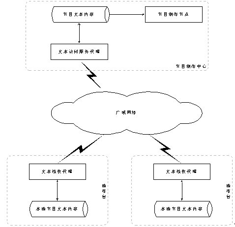 單一的節(jié)目制作中心一般放置在省中心。在節(jié)目制作中心,節(jié)目數(shù)據(jù)以數(shù)據(jù)庫或者文本文件的方式存放于節(jié)目數(shù)據(jù)倉庫中。在節(jié)目制作中心運(yùn)行文本訪問服務(wù)代理,接受各地市臺的數(shù)據(jù)請求并發(fā)送相應(yīng)的數(shù)據(jù)。各個地市臺通過文本請求、接收代理向中心請求或者接收文本數(shù)據(jù),存放于本地數(shù)據(jù)倉庫,等待語音合成服務(wù)器合成成語音文件,地市臺使用合成后的語音文件迅速開通相應(yīng)的節(jié)目。
