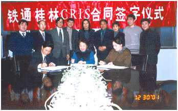 桂林CRIS項(xiàng)目經(jīng)過(guò)多方面的努力,2001年12月30日在中鐵網(wǎng)絡(luò)公司,舉行了由中鐵網(wǎng)絡(luò)公司、北京佳訊飛鴻信息技術(shù)有限公司和桂林訊聯(lián)科技有限公司三方代表參加的鐵通桂林CRIS項(xiàng)目合同簽約儀式。