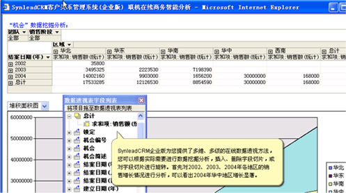 可以利用SynleadCRM企業(yè)版提供的在線聯(lián)機分析工具實現(xiàn),也可以導出到EXCEL中,利用EXCEL的有關功能實現(xiàn)。OLAP在線聯(lián)機分析,屬于商業(yè)智能BI的組成部分之一,它允許您對數(shù)據(jù)進行任意的上鉆、下鉆,旋轉(zhuǎn)、切片、切塊,得到更豐富的、更有價值的圖表和報表。