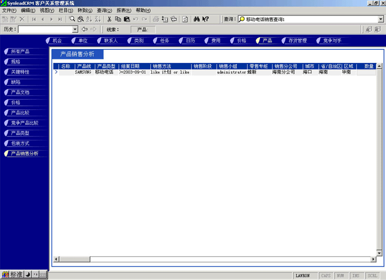 管理人員可能需要對比產(chǎn)品銷售計劃與實際銷售的產(chǎn)品數(shù)量的關系,也有可能要對比某款產(chǎn)品與競爭產(chǎn)品銷售的情況,這時候可以利用產(chǎn)品銷售統(tǒng)計功能。它最大的好處是各項目數(shù)據(jù)普遍關聯(lián),允許任意組合查詢條件(見圖4,點擊下圖,可彈出更清晰的大圖)