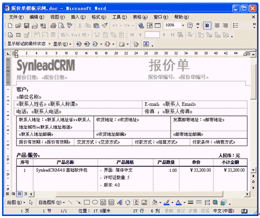 SynleadCRM企業(yè)版4.0很好地滿足了銷售自動化管理、服務(wù)自動化管理的上述需求,提供了開放的客戶化Word模板,使得用戶企業(yè)能夠根據(jù)實際情況不斷擴(kuò)展該應(yīng)用。客戶化模板直接在Word中編輯,可直觀、方便地插入合并域字段或代碼,只要對Word稍加了解就可勝任模板維護(hù)工作。
