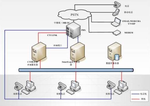 呼叫中心前端通信平臺(tái),主要由SIEMENS HiPath3800交換機(jī),計(jì)算機(jī)電話集成服務(wù)器(UltraCTI),交互式語音應(yīng)答服務(wù)器(ctsIVR),在線錄音監(jiān)聽服務(wù)器(SmartLog),數(shù)據(jù)庫服務(wù)器,MCI服務(wù)器以及傳真服務(wù)器幾個(gè)部分組成。中繼線采用30B+D接入。