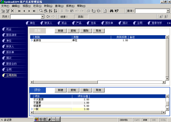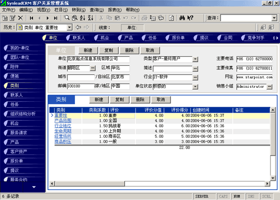 客戶單位的分類較聯(lián)系人的分類更復(fù)雜。常用的分類有:按照企業(yè)規(guī)模來分類(大、中、小,層次自定義,下同)、按照該客戶與本單位的緊密程度分類(緊密、普通、疏遠(yuǎn))、按照該客戶的重要性分類(重要、普通、次要)、按照該客戶的忠誠度分類(忠誠、普通、游移)。有一些用戶企業(yè),希望對(duì)客戶單位特征進(jìn)行采集,進(jìn)而進(jìn)行客戶信用評(píng)價(jià)。信用特征的類別可以多達(dá)數(shù)十種類(詳細(xì)情況可參考有關(guān)書籍)。利用SynleadCRM,您可以為每個(gè)類指定系數(shù),為類下屬的每個(gè)評(píng)價(jià)指定評(píng)分分值。例如,您可以建立一個(gè)類別為"客戶倉庫積壓商品的情況",系數(shù)為1,該類別下屬的評(píng)價(jià)有"很多1分"、"一般3分"、"少1分"、"未知0分",如果指定某客戶該類別的評(píng)價(jià)為一般,則該項(xiàng)目得分為3分*1(系數(shù))=3分。依此類推,您還可以指定更多的分類與評(píng)價(jià),例如:客戶經(jīng)營(yíng)場(chǎng)所所處的位置、客戶在企業(yè)生命周期中所處的位置、客戶在行業(yè)中的地位、客戶產(chǎn)品的組合情況、客戶產(chǎn)品覆蓋的市場(chǎng)范圍、客戶產(chǎn)品的淡旺季規(guī)律、客戶近年?duì)I業(yè)額的增減趨勢(shì)、客戶的年度營(yíng)業(yè)額、客戶的現(xiàn)金周轉(zhuǎn)能力、客戶的負(fù)債情況、客戶是否涉及中大訴訟等。每一個(gè)類別項(xiàng)目的評(píng)分經(jīng)過系數(shù)的加權(quán)運(yùn)算后,可以求和,得到這個(gè)客戶的總評(píng)分。未來也可以利用分析模型對(duì)此類數(shù)據(jù)進(jìn)行進(jìn)一步的分析,提供輔助決策所需要的圖表和報(bào)表。