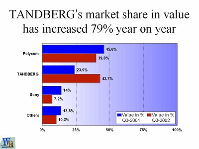 產(chǎn)地挪威,該品牌為視頻會議業(yè)界的高端產(chǎn)品。該品牌全系列均屬第三代產(chǎn)品,具有多項視頻會議的首創(chuàng)技術(shù),最高功耗只有65W,最高帶寬3M,是美國國防部、加拿大國防部、聯(lián)合國教科文組織、歐洲多個國家王室及大型跨國集團(tuán)選用的品牌。現(xiàn)在全球市場占有量第一位(依據(jù)2002年第3季度資料)。