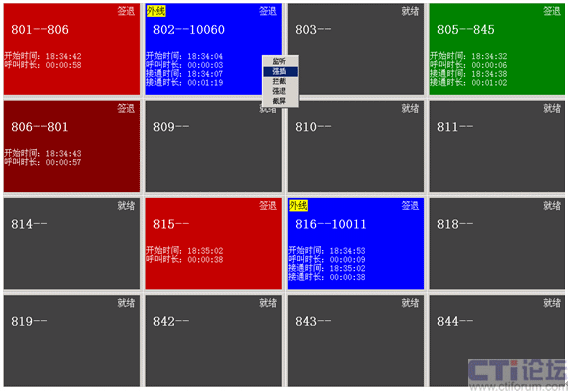 如圖1所示,管理員能實時、清晰的看到每個坐席當前的狀態(tài),并能對坐席正在進行的通話進行監(jiān)聽、強插、攔截操作,并可以對坐席進行強退、截屏操作。