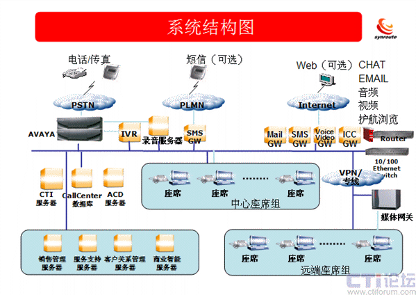 基于AVAYA S8720 交換機(jī),部署PBX、CTI服務(wù)器、Hi-Link核心控制框架、CTI Server、IVR交互式語(yǔ)音應(yīng)答、TTS、智能傳真系統(tǒng)、座席錄音管理、報(bào)表統(tǒng)計(jì)分析、呼叫中心監(jiān)控管理、系統(tǒng)配置管理、業(yè)務(wù)軟件等。