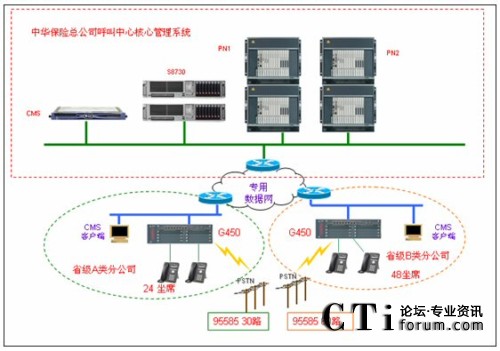 中華保險(xiǎn)呼叫中心采用IP分布式架構(gòu),總公司由一套S8730媒體服務(wù)器,4個(gè)G650組成2個(gè)PN,外加一臺(tái)CMS報(bào)表服務(wù)器組成。各地分支機(jī)構(gòu)采用G450網(wǎng)關(guān)通過中華保險(xiǎn)內(nèi)部數(shù)據(jù)專用網(wǎng)絡(luò)與總公司核心管理系統(tǒng)交互。其中省級B類分公司為60數(shù)字中繼線接入,48坐席。省級A類分公司為30路數(shù)字中繼接入,24坐席。各公司坐席采用AVAYA2410D數(shù)字話機(jī),可以提供豐富的呼叫中心話機(jī)功能,方便坐席人員使用。