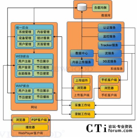 系統(tǒng)由“統(tǒng)一”管理后臺、Web前臺、WAP前臺、WebPlayer播放器、手機(jī)客戶端、采集工作站、錄制工作站、上傳客戶端、服務(wù)系統(tǒng)組成。之前已經(jīng)使用我們PC流媒體服務(wù)平臺的用戶,可以與手機(jī)流媒體系統(tǒng)合用一個后臺管理,實(shí)現(xiàn)了手機(jī)和PC平臺的統(tǒng)一后臺管理。