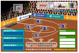 場(chǎng)地分成 5 個(gè)區(qū)域,分別對(duì)應(yīng) 1 - 5 ,想在哪個(gè)區(qū)域投籃就按電話機(jī)上對(duì)應(yīng)的 1-5 號(hào)鍵或直接在手機(jī)上寫(xiě)短信區(qū)域號(hào)( 1-5 )發(fā)送到短信號(hào)碼,即可完成一次進(jìn)攻,投中后即可可獲得獎(jiǎng)品。本游戲由電視臺(tái)、網(wǎng)站與電信運(yùn)營(yíng)商聯(lián)合經(jīng)營(yíng)的電信增值業(yè)務(wù),由電視臺(tái)提供頻道向電視觀眾播出游戲畫(huà)面(含圖像和聲音),電信運(yùn)營(yíng)商提供電話線路和短信通道,參與者通過(guò)固定電話、小靈通和手機(jī)參與游戲,運(yùn)營(yíng)方通過(guò)收取固定電話、小靈通和手機(jī)的信息費(fèi)實(shí)現(xiàn)盈利。
