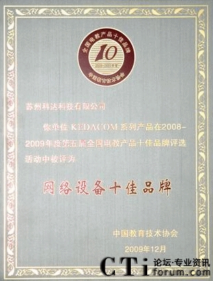 CTI論壇(ctiforum)12月14日消息(記者 張塵):2009年12月4日,由國內(nèi)教育權(quán)威機(jī)構(gòu)“中國教育技術(shù)協(xié)會”主辦,以讀者調(diào)查問卷的形式舉行的第五屆全國電教產(chǎn)品十佳品牌頒獎(jiǎng)典禮在福州梅峰賓館盛大開幕,科達(dá)教育視頻會議產(chǎn)品憑借卓越的產(chǎn)品性能和良好的客戶服務(wù)入選網(wǎng)絡(luò)產(chǎn)品類十佳之列,同時(shí)也成為首個(gè)入選十佳品牌的視頻會議產(chǎn)品。