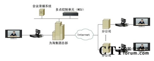 科達視頻會議解決方案就部署而言非常簡單:為海集團深圳總部的機房架設一臺多點控制單元(MCU),總部會議室、各分公司的會議室則各部署一套視頻會議終端?偛繋挒10/100M,各地分公司均通過普通ADSL接入。系統(tǒng)拓撲圖如下: