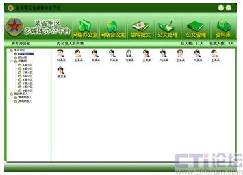 如圖所示的畫面即為網(wǎng)動協(xié)同辦公系統(tǒng)的基礎工具——協(xié)同通訊系統(tǒng),該系統(tǒng)可將部隊機構內的所有部門、人員按照實際的組織結構列出,應用該系統(tǒng)的人員通過點擊其他在線人員,從而有選擇性的與對方進行語音、視頻、數(shù)據(jù)共享、點對點會議等各種操作,將以往“看不見”的對話變?yōu)椤懊鎸γ妗钡慕涣。相比于傳統(tǒng)的電話溝通而言,它不僅更暢通快捷,更可以最大化的降低溝通成本。另外,數(shù)據(jù)共享功能還可以將軍隊里需共同探討的話題,如作戰(zhàn)地圖動態(tài)研究、工作報告資料等實時顯示在數(shù)據(jù)區(qū)中,雙方通過電腦即可進行遠程的話題討論、圈點批注。