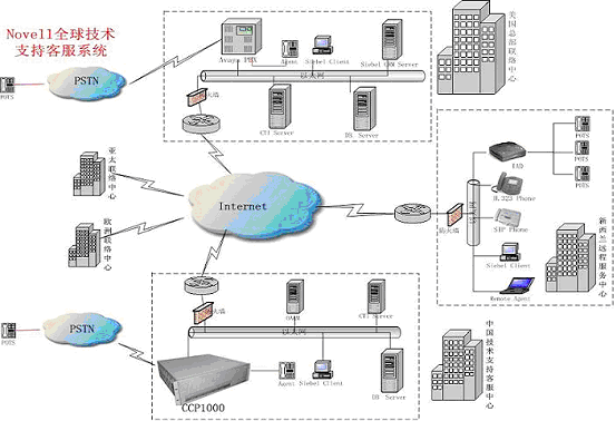 Novell中國技術(shù)支持中心采用融天科技的RT-CCP1000作為呼叫處理平臺,業(yè)務(wù)處理通過Internet用瀏覽器的方式使用美國現(xiàn)有的Siebel CRM業(yè)務(wù)系統(tǒng),作為Novell全球客戶服務(wù)支撐體系的一個分支,響應(yīng)來自全球的客戶服務(wù);贗P網(wǎng)絡(luò),系統(tǒng)設(shè)立了遠(yuǎn)端座席,為不同地區(qū)的用戶提供本地化、無差異化的服務(wù)。
