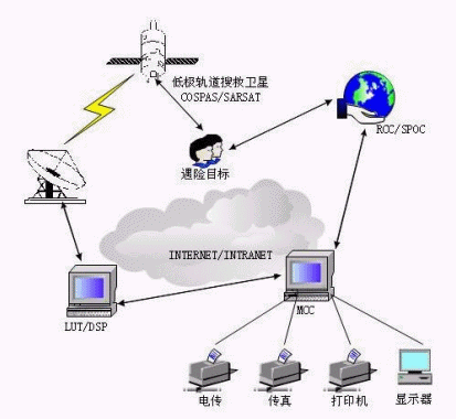 當(dāng)用戶(船舶、飛機(jī)或個人)遇險后,遇險示位信標(biāo)可以通過人工或者自動由遇險時的撞擊、水浸而激活(信標(biāo)激活后可以存活48/小時),發(fā)出121.5MHz/243MHz/4O6MHz的遇險報警信號,搜救衛(wèi)星則對遇險示位信標(biāo)發(fā)出的遇險報警信號進(jìn)行變頻、存儲、轉(zhuǎn)發(fā)等處理并轉(zhuǎn)發(fā),由幾個數(shù)據(jù)信號處理器(DSP)對衛(wèi)星的下行信號中的121.5MHz、243MHz、406MHz信號進(jìn)行實(shí)時處理或?qū)?06MHz信號進(jìn)行延時處理。由遍布全球的地面處理分系統(tǒng)本地用戶終端(LUT)接收并計算出遇險目標(biāo)的位置,把信標(biāo)的報警數(shù)據(jù)和統(tǒng)計信息送給相應(yīng)的搜救任務(wù)控制中心(MCC)。