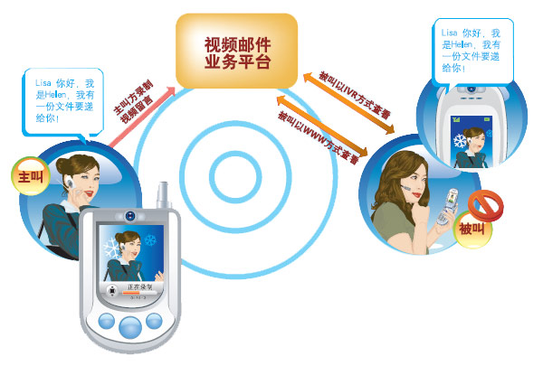 視頻郵件業(yè)務(wù)是在原有的語音郵件的基礎(chǔ)上又增加了極具個性化的視頻功能。即當(dāng)被呼叫方忙、在3G信號覆蓋區(qū)以外或是無法接聽時可以使用視頻郵件的功能。當(dāng)一個通話呼叫被切換到視頻郵件服務(wù)后,呼叫方首先將會看到一段視頻的歡迎信息,這可以是通過視頻片的方式預(yù)先錄制的個性化的視頻信息,也可以是預(yù)先設(shè)定的一個卡通形象。呼叫方可以錄下個人的視頻通話通過郵件方式傳遞給被叫。