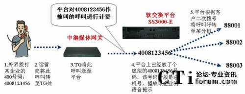 400業(yè)務(wù)又稱“主被叫分?jǐn)偢顿M(fèi)業(yè)務(wù)”,即為客戶提供一個全國范圍的400號碼,并把對該號碼的呼叫接至被叫客戶事先規(guī)定目的地(電話號碼或呼叫中心)。通常是主叫(撥打400的人)付市話費(fèi),被叫(擁有400號碼的客戶)付長途費(fèi)(主叫地區(qū)到目的地之間)SS3000-E適時推出了支持400業(yè)務(wù)的功能,即“被叫計(jì)費(fèi)”。按照下圖的指示,利用SS3000-E的被叫計(jì)費(fèi)功能,本次通話的費(fèi)用部分計(jì)在了4008123456這個號碼上。