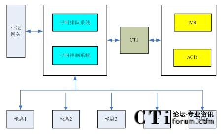 呼叫排隊(duì)系統(tǒng)首先將進(jìn)入系統(tǒng)的呼叫進(jìn)行排隊(duì),并將新來(lái)的呼叫上報(bào)給IVR系統(tǒng)。IVR系統(tǒng)向排隊(duì)的用戶播放提示音樂(lè),同時(shí)ACD系統(tǒng)根據(jù)呼叫分配策略選擇一個(gè)空閑的坐席。在選定坐席以后,CTI接口將呼叫控制命令傳到呼叫控制系統(tǒng),呼叫控制系統(tǒng)將呼叫轉(zhuǎn)接到指定的坐席。坐席人員開(kāi)始對(duì)客戶的呼叫進(jìn)行應(yīng)答受理。