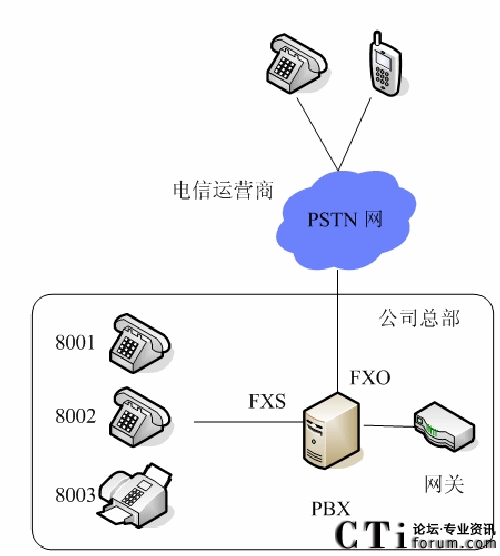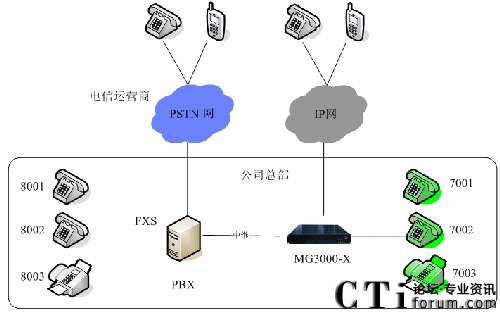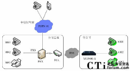 公司總部增加一臺語音網關,通過中繼線與原有的PBX相連,異地分公司增加一臺IPPBX,下面開通分機,公司總部和分公司通過IP網連接在了一起。