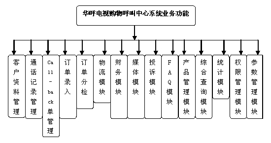 華呼電視購物呼叫中心系統(tǒng)業(yè)務功能結構示意圖如下: