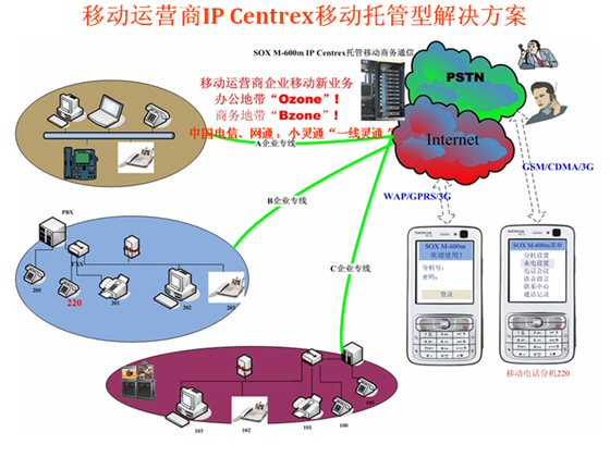 Mail,可發(fā)起WAP電話會(huì)議,可訪問企業(yè)的CRM、ERP等應(yīng)用軟件并集成點(diǎn)擊呼叫等等)。不僅移動(dòng)運(yùn)營(yíng)商可以替代第一代的移動(dòng)總機(jī),固網(wǎng)運(yùn)營(yíng)商采用SOX-M移動(dòng)軟交換也可以輕松的開展移動(dòng)總機(jī)(小靈通或手機(jī))的業(yè)務(wù)了,但SOX-M系統(tǒng)融合移動(dòng)運(yùn)營(yíng)商的無(wú)線互聯(lián)網(wǎng)數(shù)據(jù)業(yè)務(wù)將產(chǎn)生更大的利于企業(yè)應(yīng)用的前景,移動(dòng)總機(jī)(語(yǔ)音+WAP)的融合應(yīng)用成為第二代移動(dòng)總機(jī)殺手級(jí)應(yīng)用,令移動(dòng)總機(jī)如虎添翼。
