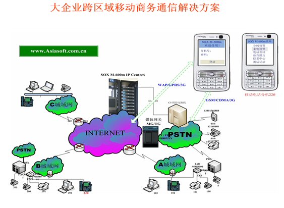 該方案為企業(yè)提供了跨地域的低成本、高效率、方便靈活的IP融合通信基本服務(wù)和增值服務(wù),使用SOX-M就不再有地域限制,宛如本地化電話分機(jī)辦公通信一樣,而且還可以享有更多的增值服務(wù):語(yǔ)音信箱、電話會(huì)議、一號(hào)通、等候音樂、語(yǔ)音菜單、呼叫篩選等等,更具特色的是提供了融合通信的新型“移動(dòng)總機(jī)”和“移動(dòng)分機(jī)”服務(wù),可以使我們手里的移動(dòng)電話(即手機(jī))完全成為辦公室分機(jī),可以在手機(jī)上完成固定分機(jī)的PBX特性功能,如在線轉(zhuǎn)接,即時(shí)會(huì)議等,通過(guò)SOX-M可以直接管理分機(jī)各種設(shè)置,如“來(lái)電管理、手機(jī)聽取語(yǔ)音留言、WAP上召開電話會(huì)議、聯(lián)系中心(CRM)WAP點(diǎn)擊呼叫”等等,實(shí)現(xiàn)了語(yǔ)音和數(shù)據(jù)融合通信給企業(yè)帶來(lái)的更多好處。