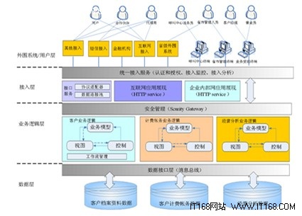 其中,外圍系統(tǒng)/用戶層主要指系統(tǒng)相關(guān)的外圍系統(tǒng),以及業(yè)務(wù)受理、系統(tǒng)管理、綜合查詢、繳費(fèi)、統(tǒng)計(jì)報(bào)表、帳務(wù)管理等與客戶或操作人員交互的應(yīng)用系統(tǒng)界面。接入層為最終客戶提供統(tǒng)一的客戶接觸、服務(wù)平臺,為各個(gè)營銷渠道服務(wù)人員提供良好的工作平臺,支撐其為客戶提供優(yōu)質(zhì)服務(wù),同時(shí)為其它外圍系統(tǒng)和機(jī)構(gòu)提供實(shí)時(shí)、定時(shí)批處理接口。業(yè)務(wù)邏輯層(應(yīng)用層)是系統(tǒng)的最核心部分,它接收來自表現(xiàn)層的功能請求,是實(shí)現(xiàn)各種業(yè)務(wù)功能的邏輯實(shí)體,如業(yè)務(wù)受理中的業(yè)務(wù)新裝、開/停機(jī)、業(yè)務(wù)變更以及話費(fèi)查詢、報(bào)表統(tǒng)計(jì)計(jì)算等。數(shù)據(jù)層用于存放并管理各種系統(tǒng)數(shù)據(jù),如客戶資料數(shù)據(jù)、資源數(shù)據(jù)、銷售數(shù)據(jù)、統(tǒng)計(jì)分析數(shù)據(jù)等。