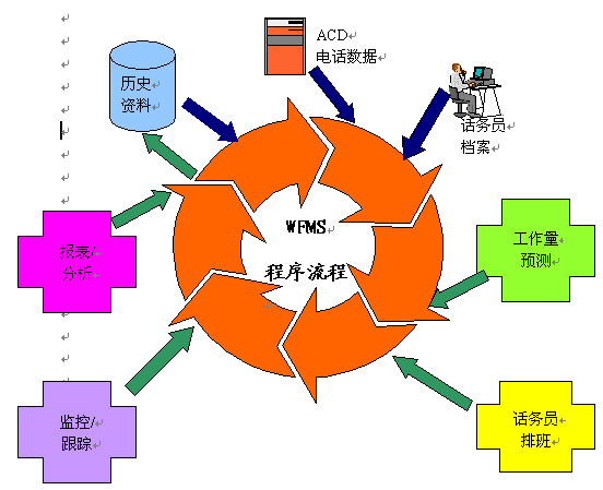 如上面所描述的WFMS流程,最初開始于歷史的電話信息、目前的ACD數(shù)據(jù)和服務代表的簡介。從這些綜合的信息,做出對工作量的預測,從而從本質上決定了配備給呼叫中心的服務代表數(shù)量。了解了服務代表的需求數(shù)量,一個適用于任何時間段的工作時間表就可以產(chǎn)生了,包括每天的,每周的,每月的。基于這一點,主管人就可以監(jiān)控服務代表的行為,追蹤來電,并分析不同種類的來電分組,做出應對假定情景的方案,從而產(chǎn)生各種各樣的報告和圖表。
