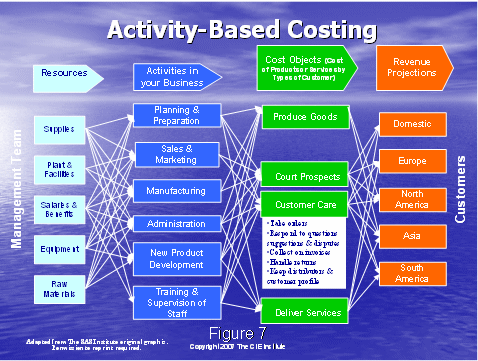 通過了解圖8,我們將以行動(dòng)成本管理大體是什么的總括作為結(jié)束。我們從左邊的成本驅(qū)動(dòng)因素開始——這是做工作的原因,例如:獲得客戶,維持客戶。就如圖4中所說的,這些成本驅(qū)動(dòng)因素可以細(xì)分到工作行動(dòng)上去?梢酝ㄟ^描述人,培訓(xùn),設(shè)備和技術(shù)資源來組成工作行動(dòng)。資源驅(qū)動(dòng)因素被用于分配這些企業(yè)成本到各個(gè)行動(dòng)上去。下一步就是系統(tǒng)地確定行動(dòng)驅(qū)動(dòng)因素,分配行動(dòng)成本到成本對(duì)象上去,這有利于決策的制定。例如,獲得一個(gè)客戶和維持一個(gè)客戶需要花費(fèi)多少的成本?
