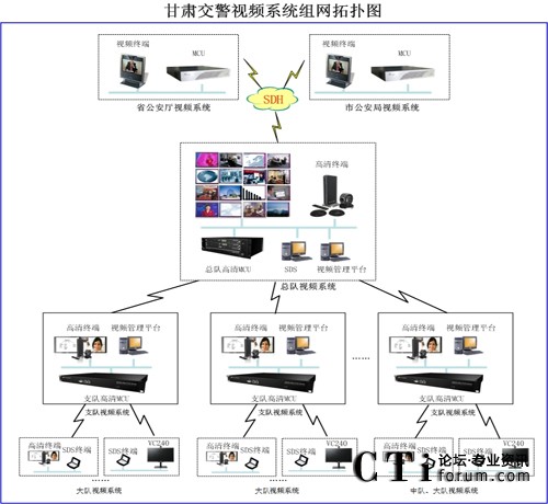 本次建設(shè)的交警總隊(duì)視頻會(huì)議系統(tǒng),包含覆蓋全省交警總隊(duì)、多個(gè)支隊(duì)、大隊(duì)、中隊(duì)的大型視頻會(huì)議網(wǎng)絡(luò)。其中包含了2個(gè)總隊(duì)會(huì)場(chǎng)16個(gè)支隊(duì)、100個(gè)大隊(duì)與16個(gè)中隊(duì)。交警總隊(duì)、支隊(duì)、大(中)隊(duì)與省公安廳、市州公安局通過(guò)SDH專(zhuān)線進(jìn)行交互訪問(wèn),支隊(duì)與市州公安局、大隊(duì)與區(qū)縣公安局、總隊(duì)到各支隊(duì)的網(wǎng)絡(luò)均為專(zhuān)線聯(lián)接。